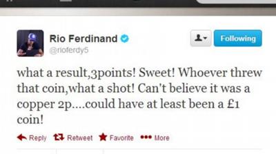 Καθόλου δεν φαίνεται να πτόησε την διάθεση του Ρίο Φέρντιναντ, το κέρμα που δέχθηκε στο φρύδι λίγο πριν τη λήξη του ντέρμπι του Μάντσεστερ ανάμεσα στη Γιουνάιτεντ και τη Σίτι.