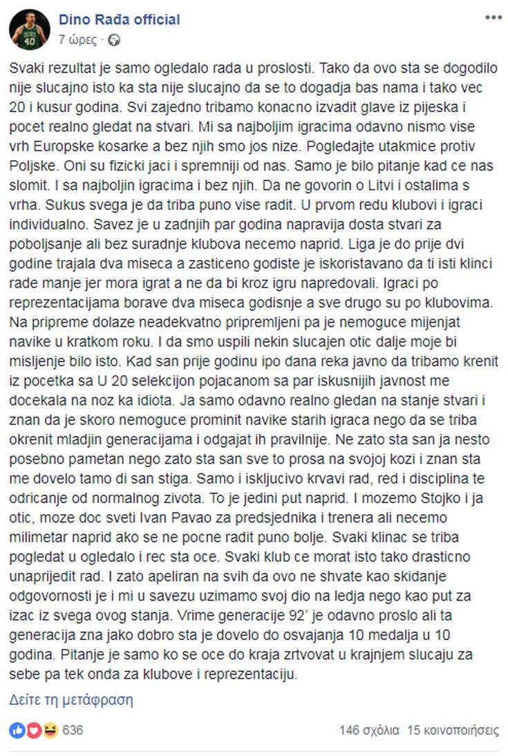 Ο Ντίνο Ράτζα, ο Κροάτης θρύλος του μπάσκετ, έγραψε τις σκέψεις του στο Facebook μετά το αποκλεισμό της Κροατίας από το Παγκόσμιο Κύπελλο της Κίνας.