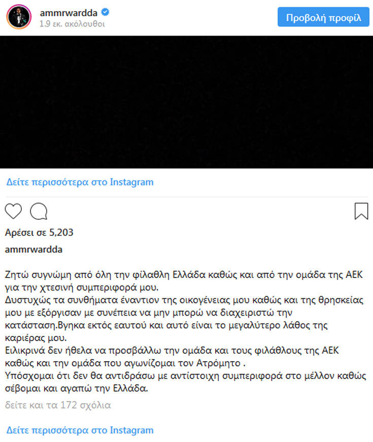 Συγγνώμη από την ΑΕΚ και όλη τη φίλαθλη Ελλάδα ζήτησε για τη συμπεριφορά του στο χθεσινό παιχνίδι Κυπέλλου ο Αμρ Ουάρντα. Σύμφωνα με όσα έγραψε στο προφίλ του στο Instagram, ο λόγος που εκείνος αντέδρασε έτσι, ήταν πως τον εξόργισαν τα συνθήματα εναντίον της οικογένειάς του και της θρησκείας του. Μάλιστα, έδωσε την υπόσχεση ότι δεν θα ξανακάνει κάτι τέτοιο στο μέλλον.