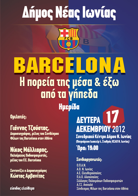 Ο Δήμος Νέας Ιωνίας σε συνεργασία με τα αθλητικά σωματεία της πόλης Α.Ο. Ν.Ιωνίας – Ελευθερούπολη – Αλσούπολη – Ανατολή, το σύλλογο Παλαίμαχων Ποδοσφαιριστών και το σύνδεσμο Φίλων της Μπαρτσελόνα Αθήνας, διοργανώνει τη Δευτέρα 17 Δεκεμβρίου στις 7.00 μ.μ. στο συνεδριακό χώρο του Δήμου (Πατριάρχου Ιωακείμ 4 – Σταθμός ΗΣΑΠ Ν. Ιωνίας), Ημερίδα, με θέμα «Barcelona» η πορεία της μέσα και έξω από τα γήπεδα».