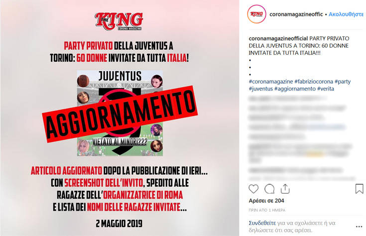 Στο περιοδικό «The King», που είναι δημιούργημα του διάσημου Ιταλού παπαράτσι, Φαμπρίτσιο Κορόνα, δημοσιεύονται και συνομιλίες που είχαν τα συγκεκριμένα μοντέλα στα social media για το πάρτι. Μάλιστα, σύμφωνα με όσα αναφέρονται, μόλις δύο παίκτες της Γιούβε δεν πήγαν. Και ο Κριστιάνο Ρονάλντο ήταν εκεί, ενώ το όλο σκηνικό φέρεται να είχε διάρκεια σχεδόν μια ημέρα.