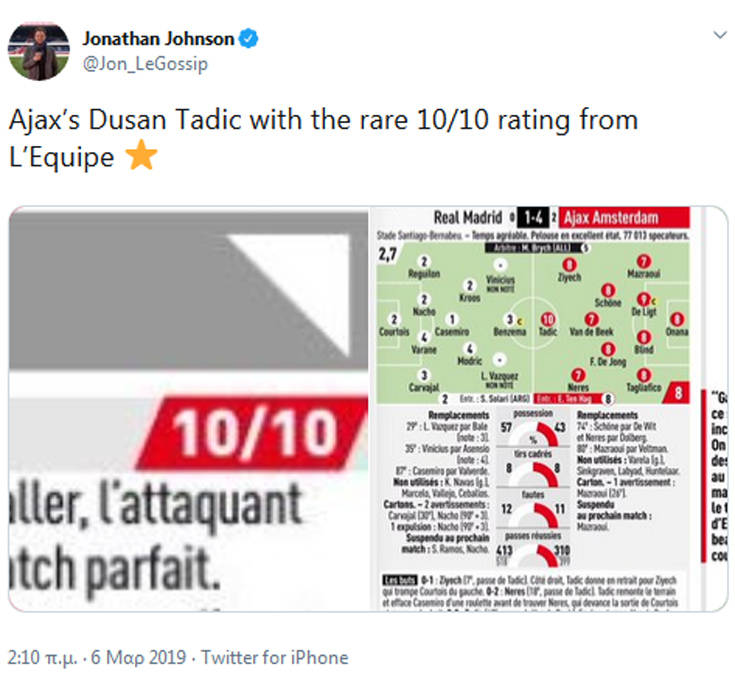 Η εμφάνισή του απέναντι στη Ρεάλ Μαδρίτης στο «Σαντιάγο Μπερναμπέου» και ο ρόλος του Ντούσαν Τάντιτς στη μεγαλειώδη και ιστορική πρόκριση του Άγιαξ, τον έκαναν έναν από τους ελάχιστους που έχουν πάρει 10 στη βαθμολογία της αυστηρότατης Equipe στην ιστορία κυκλοφορίας της γαλλικής εφημερίδας.