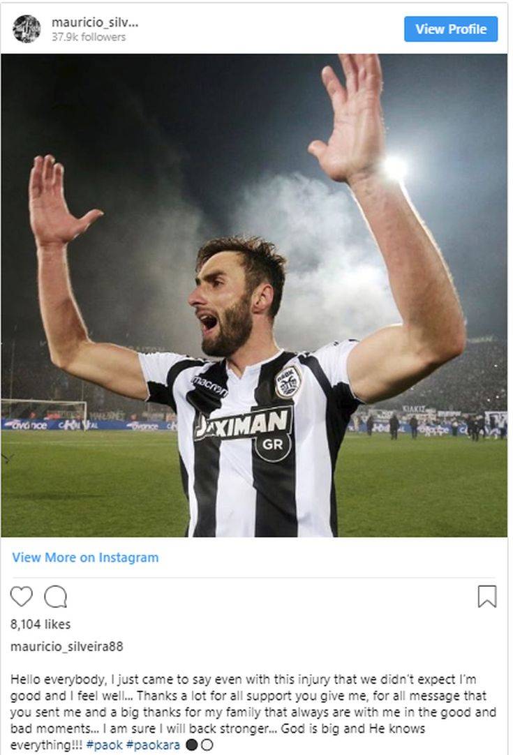 «Γεια σας. Απλά θέλω να πω ότι ακόμη και με αυτόν τον τραυματισμό που δεν τον περίμενα, είμαι καλά και νιώθω καλά. Σας ευχαριστώ πάρα πολύ για όλη την στήριξη που μου δίνετε, για όλα τα μηνύματα που μου έχετε στείλει και ένα μεγάλο ευχαριστώ στην οικογένεια μου που βρίσκεται πάντα δίπλα μου σε καλές και κακές στιγμές. Είμαι σίγουρος πως θα επιστρέψω πιο δυνατός. Ο Θεός είναι μεγάλος και ξέρει τα πάντα. ΠΑΟΚάρα!», ήταν το μήνυμα του Μαουρίσιο.