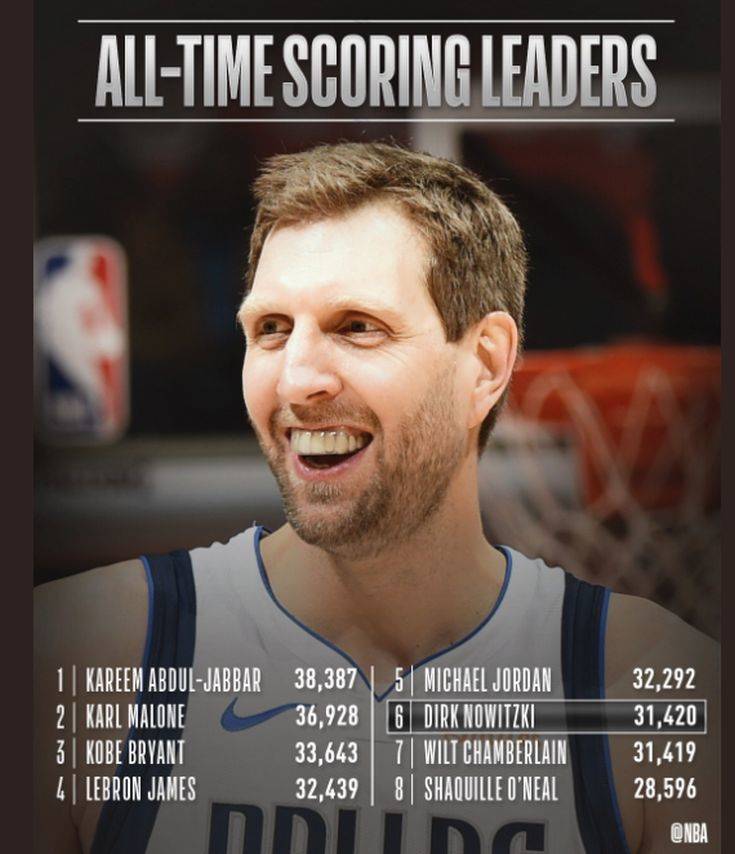 Ο Γερμανός φόργουορντ των Μάβερικς έφτασε νωρίς στο ματς κόντρα στους Πέλικανς τους 31.420 πόντους και πλέον είναι 6ος σκόρερ στην ιστορία του κορυφαίου πρωταθλήματος μπάσκετ στον πλανήτη. Έτσι, άφησε πίσω του τον Ουίλτ Τσάμπερλεϊν με 31.419.