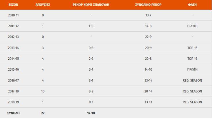 Στα 27 ματς που έχει απουσιάσει το ρεκόρ του Ολυμπιακού είναι 17-10.