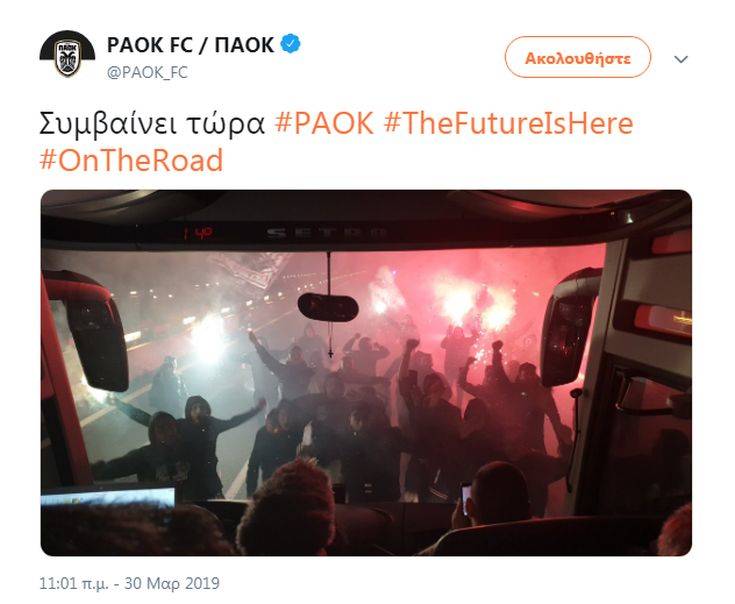 Οι γνωστοί για το πάθος του οπαδοί του ΠΑΟΚ έδωσαν το πρώτο δείγμα γραφής στους παίκτες της ομάδας, κάνοντας μπλόκο με καπνογόνα στο πούλμαν και αποθεώνοντας τους αήττητους του φετινού Πρωταθλήματος, ζητώντας πρωτάθλημα και Κύπελλο στον Πύργο τον Λευκό.