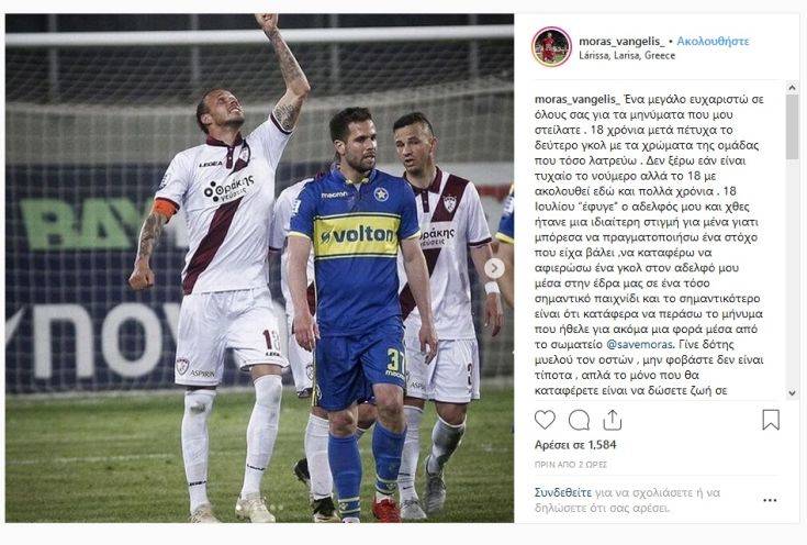 «Ένα μεγάλο ευχαριστώ σε όλους σας για τα μηνύματα που μου στείλατε. 18 χρόνια μετά πέτυχα το δεύτερο γκολ με τα χρώματα της ομάδας που τόσο λατρεύω. Δεν ξέρω εάν είναι τυχαίο το νούμερο αλλά το 18 με ακολουθεί εδώ και πολλά χρόνια. 18 Ιουλίου “έφυγε” ο αδελφός μου και χθες ήτανε μια ιδιαίτερη στιγμή για μένα γιατί μπόρεσα να πραγματοποιήσω ένα στόχο που είχα βάλει ,να καταφέρω να αφιερώσω ένα γκολ στον αδελφό μου μέσα στην έδρα μας σε ένα τόσο σημαντικό παιχνίδι και το σημαντικότερο είναι ότι κατάφερα να περάσω το μήνυμα που ήθελε για ακόμα μια φορά μέσα από το σωματείο @savemoras.