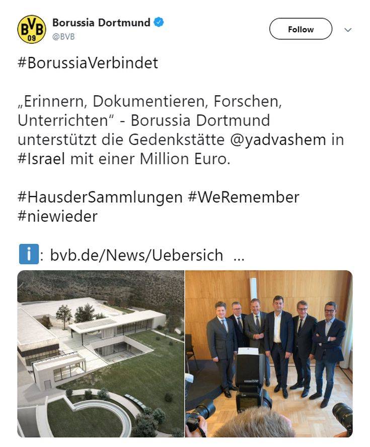 Η Μπορούσια Ντόρτμουντ αποτελεί έναν σύλλογο που δείχνει έμπρακτα την ευαισθησία του σε κοινωνικά θέματα πολύ συχνά. Έτσι οι άνθρωποί της προχώρησαν σε ακόμα μια σημαντική κίνηση, καθώς αποφάσισαν να προσφέρουν το ποσό του 1 εκατομμυρίου ευρώ στο Γιαντ Βασέμ, ένα μνημείο για τα θύματα του Ολοκαυτώματος, το οποίο βρίσκεται στα Ιεροσόλυμα.