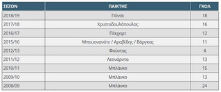 Αναλυτικά η λίστα με τους πρώτους σκόρερ της ΑΕΚ από το 2009 ως σήμερα στη μεγάλη κατηγορία: