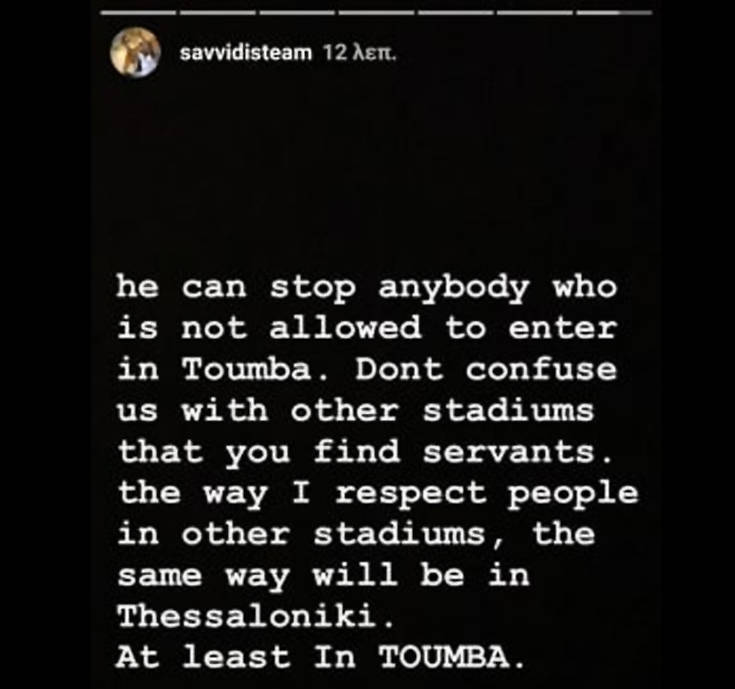 «Μπορεί να εμποδίσει οποιονδήποτε δεν έχει εξουσιοδότηση να μπει στην Τούμπα. Μην μας μπερδεύετε με άλλα γήπεδα, στα οποία βρίσκετε υπηρέτες. Όπως σέβομαι τον κόσμο στα άλλα γήπεδα, το ίδιο ισχύει και στην Θεσσαλονίκη. Στην Τούμπα, τουλάχιστον».