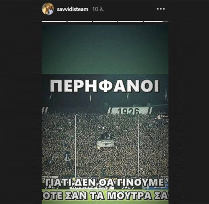 Μέσω του Instagram, ο γιος του μεγαλομετόχου της «ασπρόμαυρης» ΠΑΕ και μέλος του Διοικητικού της Συμβουλίου, τοποθετήθηκε με τρία stories, με το ένα να αναφέρει σχετικά: «Περήφανοι, γιατί δεν θα γίνουμε ποτέ σαν τα μούτρα σας».