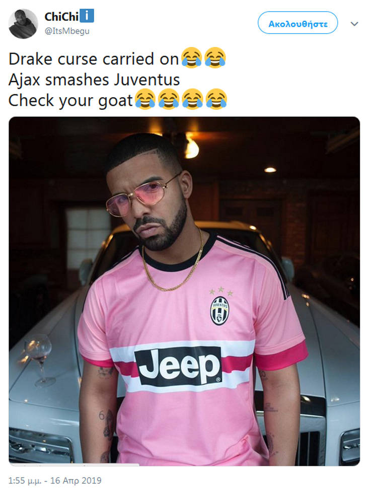 Μετά τις Μπορούσα Ντόρτμουντ, Άρσεναλ, Μάντσεστερ Σίτι και Παρί Σεν Ζερμέν, η Γιουβέντους είναι το νέο «θύμα» του δημοφιλούς Καναδού ράπερ. Εκείνος εμφανίστηκε με τη φανέλα του συλλόγου από το Πιεμόντε και η μοίρα ήταν λίγο πολύ προδιαγεγραμμένη. Την επισφράγισε η κεφαλιά του Ντε Λιχτ, που ξεκαθάρισε το ποια ομάδα θα έπαιρνε χθες το βράδυ την πρόκριση.