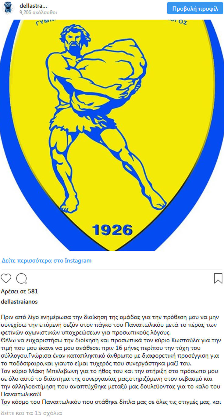 Παρελθόν από την τεχνική ηγεσία του Παναιτωλικού θα αποτελέσει ο Τραϊανός Δέλλας. Ο «Κολοσσός» μέσω των social media γνωστοποίησε πως δεν θα συνεχίσει στον πάγκο των «κυανοκίτρινων» και την επόμενη σεζόν, ενώ με μία μακροσκελή ανάρτηση ευχαρίστησε όλους στην ομάδα.