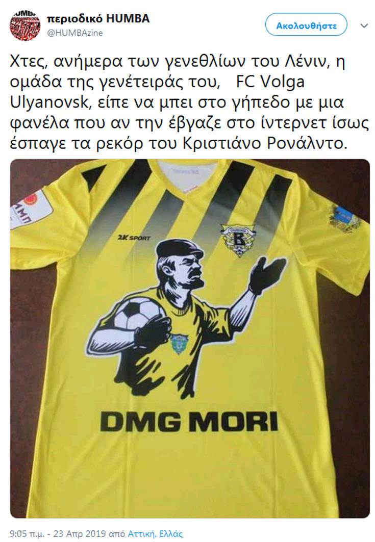 Ο Βλαντιμίρ Λένιν ζει ακόμη στις συνειδήσεις των Ρώσων και παίζει μπάλα, με τη μορφή του μάλιστα να κάνει την εμφάνισή της στη φανέλα της ομάδας του ποδοσφαιρικού συλλόγου της γενέτειράς του. Και μπορεί το φόντο να μην είναι κόκκινο, αλλά κιτρινόμαυρο, αλλά αυτό δεν φάνηκε να χαλάει κανένας στην Βόλγκα Ουλιάνοφσκ.