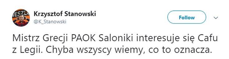 Η πιο συγκεκριμένη αναφορά γίνεται από τον δημοσιογράφο Κριστόφ Στανόφσκι, ο οποίος στο λογαριασμό του στο Twitter έγραψε: «Ο πρωταθλητής Ελλάδας, ΠΑΟΚ, ενδιαφέρεται για τον Καφού της Λέγκια. Νομίζω ότι όλοι ξέρουμε τι σημαίνει αυτό».
