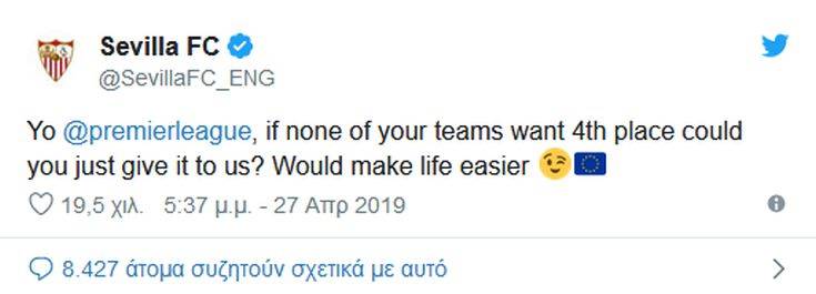 «Yo Premier League, αν καμία από τις ομάδες σας δεν θέλει την 4η θέση, θα μπορούσατε να τη δώσετε σε εμάς; Θα έκανε τη ζωή πολύ πιο εύκολη», ήταν το επικό μήνυμα των Σεβιγιάνων στα social media.