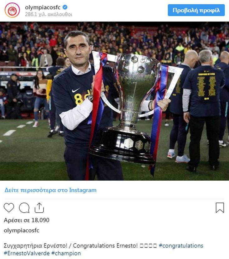 Τα συγχαρητήριά του για την κατάκτηση της La Liga με τη Μπαρτσελόνα έστειλε ο Ολυμπιακός στον Ερνέστο Βαλβέρδε.