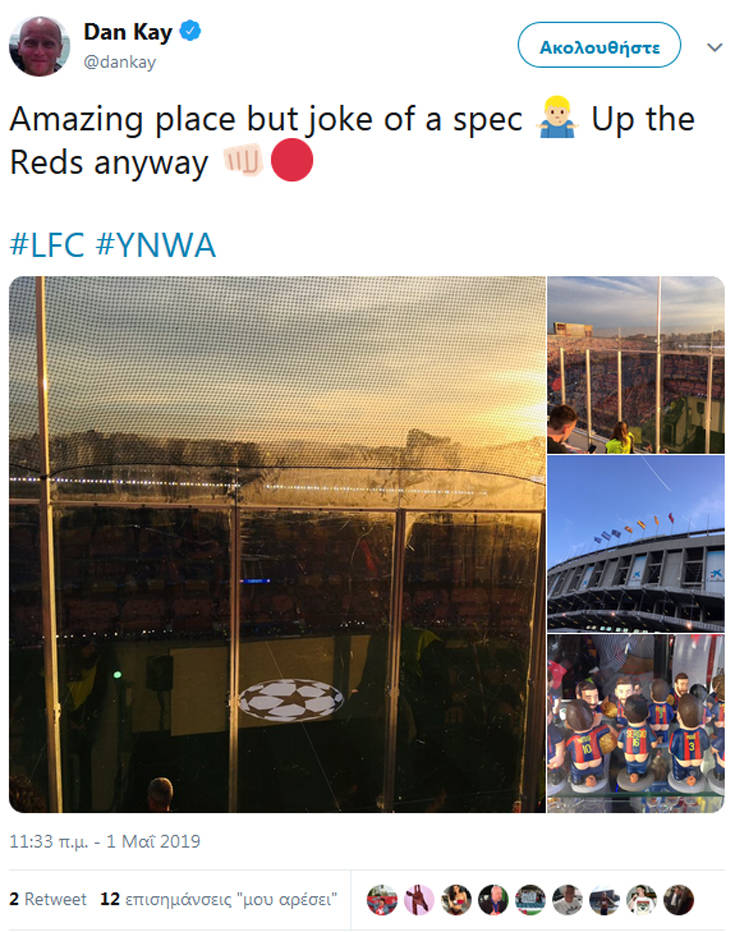 Δεν τους έφτανε η ήττα της ομάδας τους με 3-0, οι οπαδοί της Λίβερπουλ που παρακολούθησαν στο «Καμπ Νου» τον πρώτο ημιτελικό για το Champions League με αντίπαλο την Μπαρτσελόνα είχαν να πονοκεφαλιάζουν και για την άθλια θέα του γηπέδου που είχαν, όντας αναγκασμένοι να βλέπουν το ματς από το πιο ψηλό σημείο του πάνω διαζώματος, με ένα πλεξιγκλάς μπροστά τους, ενώ το φως του δύοντος ηλίου έπεφτε πάνω σε αυτό.
