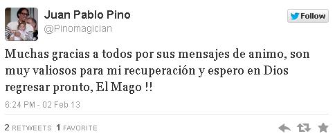 Πολλές ευχές για ταχεία ανάρρωση έχει δεχθεί ο Χουάν Πάμπλο Πίνο στον προσωπικό του λογαριασμό στο Twitter.