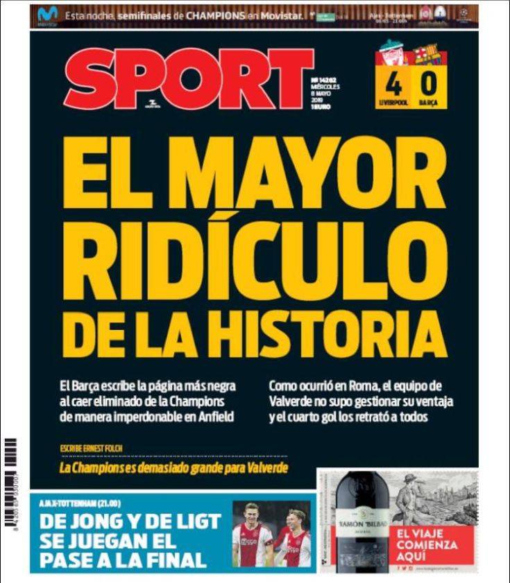 «Ντροπή», αναφέρει η άλλη καταλανική εφημερίδα, η Mundo Deportivo, η οποία -μεταξύ άλλων- σημειώνει: «Μια Μπάρτσα χωρίς ψυχή βιώνει την καταστροφή στο Άνφιλντ. Το τέταρτο γκολ είναι ο επιτάφιος μιας ομάδας που επανέλαβε αυτό που συνέβη στη Ρώμη».