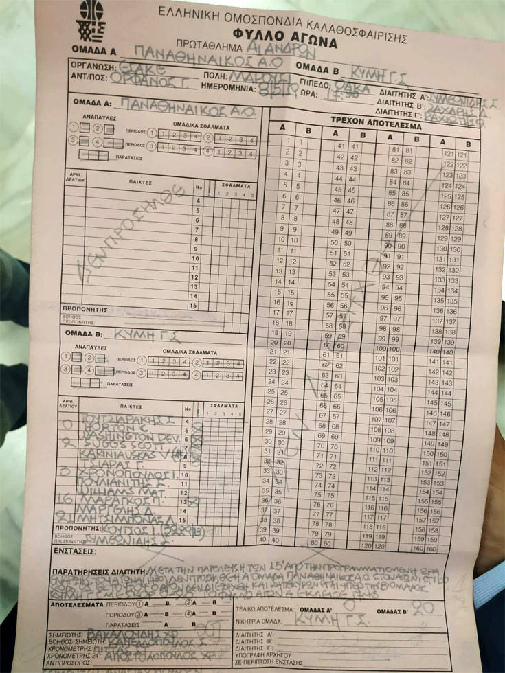 Το φύλλο αγώνος έκλεισε και αναγράφει: «Μετά την παρέλευση των 15 λεπτών από την προγραμματισμένη ώρα έναρξης του αγώνα (17:30), δεν προσήλθε η Α’ Ομάδα Παναθηναϊκός στον αγωνιστικό χώρο. Ως εκ τούτου, ο αγώνας δεν διεξήχθη και κατακυρώνεται υπέρ της Β’ Ομάδος Κύμη Γ.Σ. με σκορ 0-20. Το Φύλλο Αγώνα έκλεισε (17:45)».