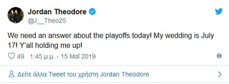 Οι Τζόρνταν Θίοντορ και Τουγκμπά Τασκί έχουν ορίσει την ημερομηνία του γάμου τους στις 17 Ιουλίου. Φυσικά, δεν περίμεναν τι θα επικρατούσε στο ελληνικό μπάσκετ με τις ημερομηνίες των playoffs.