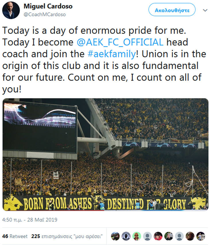 Ανέβασε στον προσωπικό του λογαριασμό μια φωτογραφία με τους οργανωμένους της ομάδας, την οποία συνόδευσε με τη λεζάντα: «Σήμερα είναι μια μέρα τεράστιας περηφάνιας για μένα. Σήμερα έγινα προπονητής της ΑΕΚ και γίνομαι μέρος της οικογένειας της ΑΕΚ. Η Ένωση αποτελεί την προέλευση αυτού του συλλόγου και είναι επίσης θεμελιώδης για το μέλλον μας. Βασιστείτε σε μένα, εγώ βασίζομαι σε όλους εσάς».