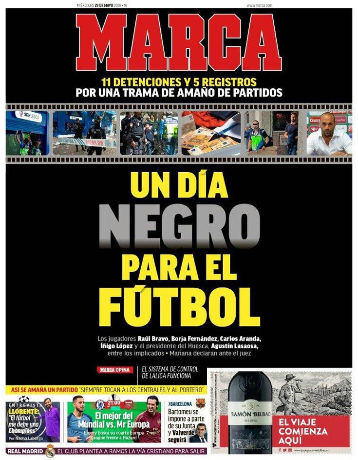 Χαρακτηριστικό είναι το πρωτοσέλιδο της Marca, με την εφημερίδα να… πενθεί για την κατάσταση του ισπανικού ποδοσφαίρου μετά και την αποκάλυψη για το κύκλωμα και τις συλλήψεις. Αυτό έχει ένα κατάμαυρο φόντο και μεγάλο τίτλο που λέει «Μαύρη ημέρα για το ποδόσφαιρο».