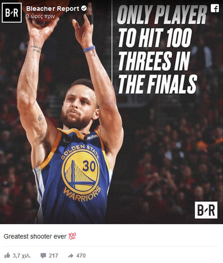 O Στεφ Κάρι φροντίζει να συντηρεί τον μύθο του και το κάνει μέσα στο παρκέ με τον καλύτερο τρόπο. Με τα 4 τρίποντα που έβαλε κόντρα στους Ράπτορς έφτασε τα 100 σε Τελικούς, με τον ΛεΜπρον Τζέιμς να ακολουθεί στην λίστα με 86 και την τριάδα ολοκληρώνει ο Κλέι Τόμπσον με 62.