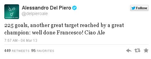 «225 γκολ, ακόμη ένας σπουδαίος στόχος επετεύχθη από έναν μεγάλο πρωταθλητή. Μπράβο, Φραντσέσκο», έγραψε σχετικά ο «πιντουρίκιο» στον προσωπικό του λογαριασμό στο Twitter.