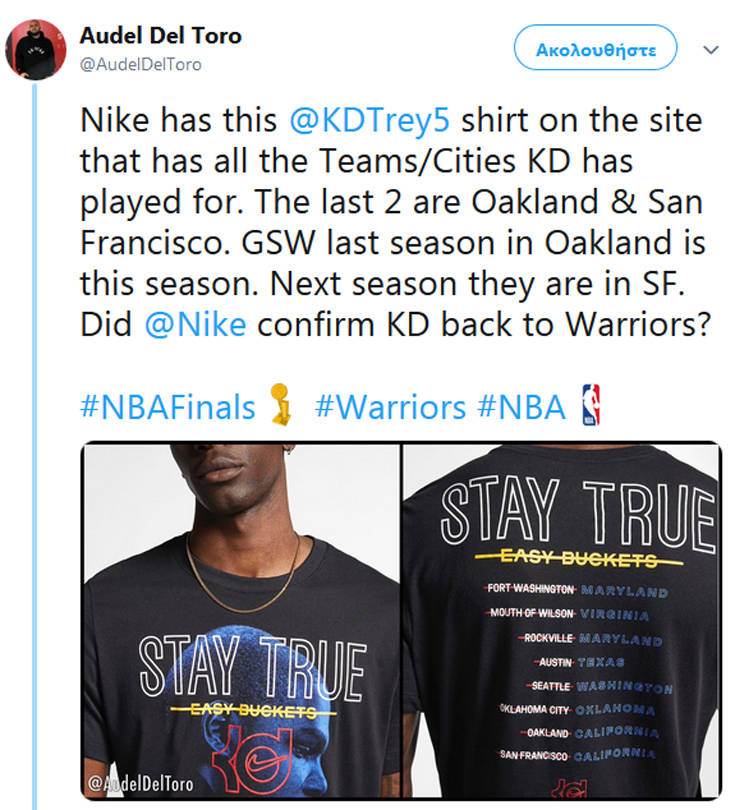 Την… αποκάλυψη έκανε ένας παρατηρητικός χρήστης στο Twitter, που έγραψε ότι στα μπλουζάκια αυτά που περιλαμβάνονται όλες οι ομάδες/πόλεις που έπαιξε ο Ντουράντ, στο τέλος υπάρχει το Σαν Φραντσίσκο. Στο οποίο η νυν ομάδα του θα μετακομίσει την ερχόμενη σεζόν, αφήνοντας το Όκλαντ. «Αυτό σημαίνει ότι μένει στους Ουόριορς;», διερωτήθηκε.