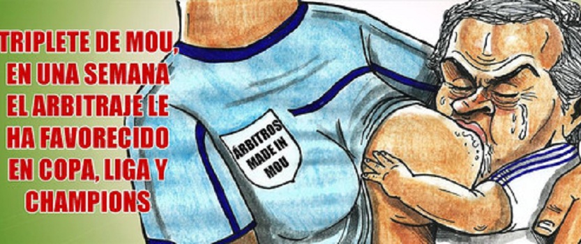 «Τρεμπλ από τον Μουρίνιο, που σε μία εβδομάδα ευνοήθηκε από τη διαιτησία σε Κύπελλο, πρωτάθλημα και Champions League», αναφέρει η λεζάντα της γελοιογραφίας, που εμφανίζει τον Μουρίνιο να σταματά το… κλάμα όταν βυζαίνει από το στήθος της διαιτησίας.