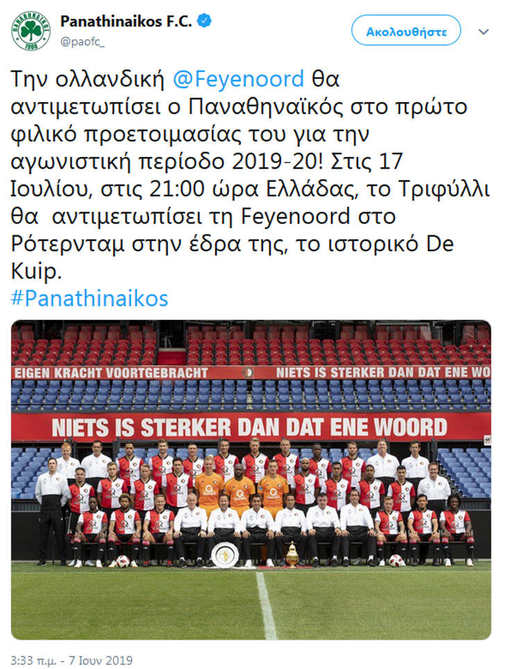 «Την ολλανδική Φέγενορντ θα αντιμετωπίσει ο Παναθηναϊκός στο πρώτο φιλικό προετοιμασίας του για την αγωνιστική περίοδο 2019-20! Στις 17 Ιουλίου, στις 21:00 ώρα Ελλάδας, το Τριφύλλι θα αντιμετωπίσει τη Φέγενορντ στο Ρότερνταμ στην έδρα της, το ιστορικό De Kuip», έκανε γνωστό το «τριφύλλι».