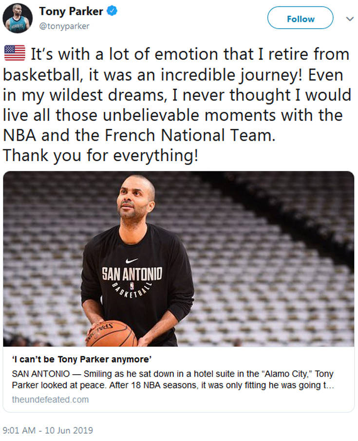 Με αυτό το μήνυμα στα social media ο Τόνι Πάρκερ ανακοίνωσε πως αποχωρεί από την ενεργό δράση και «κρεμάει» τα παπούτσια του.