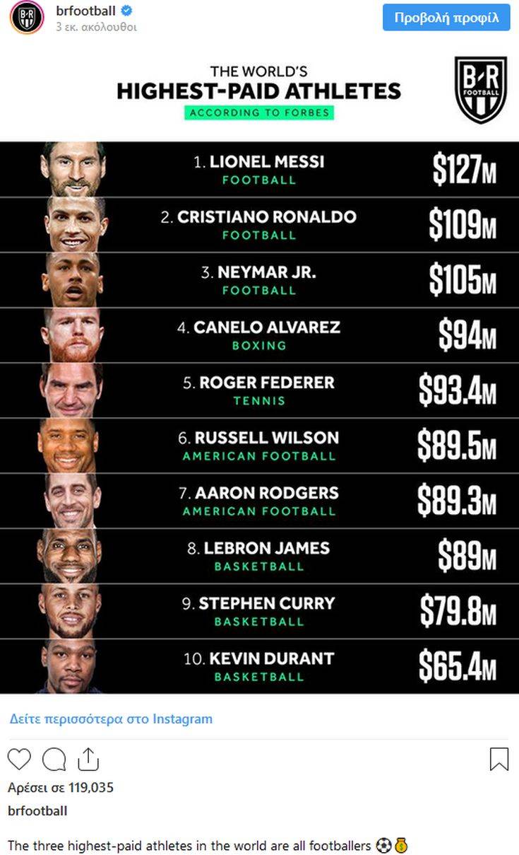 Πιο ακριβοπληρωμένος αθλητής για το 2019 αναδείχτηκε ο Λιονέλ Μέσι, 2ος ο Ρονάλντο, 3ος ο Νεϊμάρ στην ποδοσφαιρική κυριαρχία. Που βρίσκονται ΛεΜπρόν, Κάρι, Ντουράντ. Δείτε τους 100 πιο πλούσιους αθλητές της σεζόν σύμφωνα με το έγκυρο οικονομικό περιοδικό.