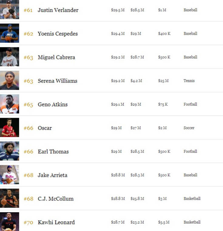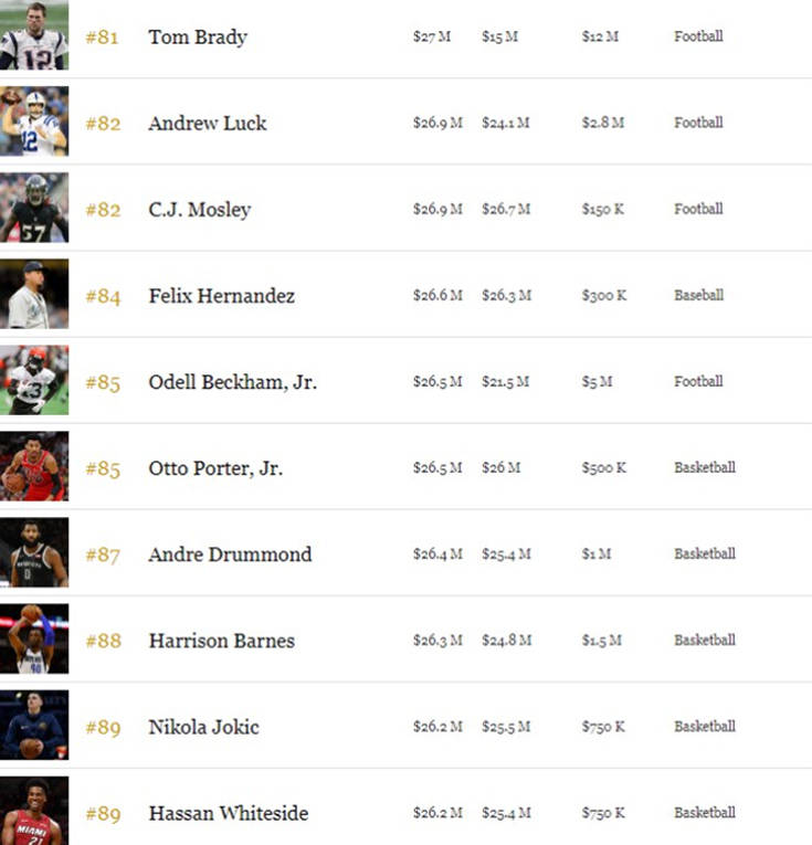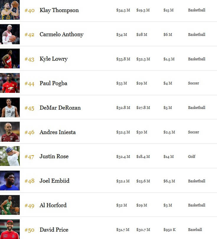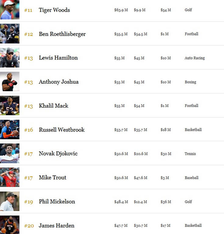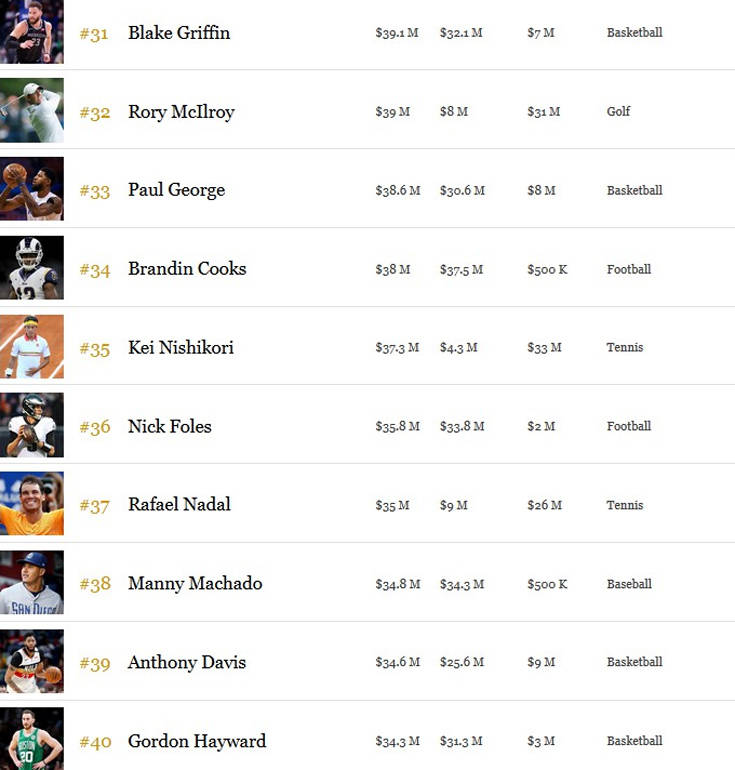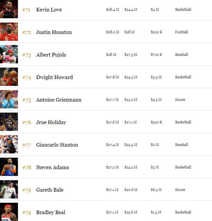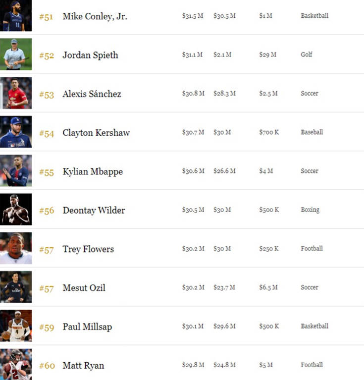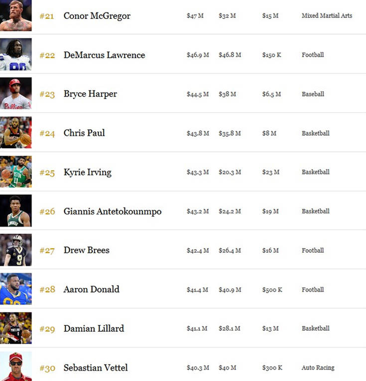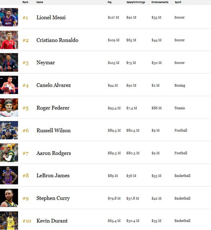 Το ποδόσφαιρο είναι εκείνο που κυριαρχεί απόλυτα για φέτος, καθώς στη 2η θέση βρίσκεται ο Κριστιάνο Ρονάλντο (109 εκατ. δολάρια) και στην 3η ο Νεϊμάρ (105 εκατ. δολάρια). Τη 10άδα συμπληρώνουν ο πυγμάχο, Κανέλο Αλβαρες, ο τενίστας Ρότζερ Φέντερερ, οι σούπερ σταρ του αμερικανικού ποδοσφαίρου, Ράσελ Γουίλσο, Ααρον Ρότζερς, ενώ στις τρεις τελευταίες θέσεις συναντάμε τους μπασκετικούς, Λεμπρόν Τζέιμς, Στεφ Κάρι και Κέβιν Ντουράντ. Ο Γιάννης Αντετοκούνμπο βρίσκεται στηξν 26η θέση με 43,2 εκατομμύρια.