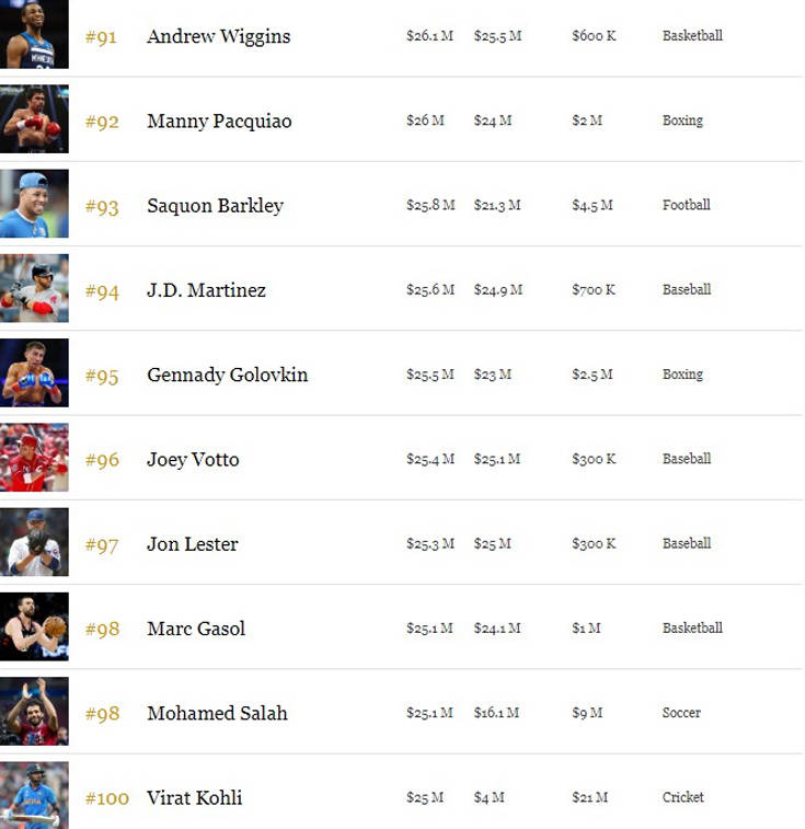 Συνολικά οι 100 καλύτερα αμειβόμενοι αθλητές φτάνουν τα 4 δισ. Δολάρια, ενώ πέρσι όλοι μαζί ήταν στα 3,8 δισ., κάτι που δείχνει αύξηση της τάξης του 5% στα έσοδά τους.