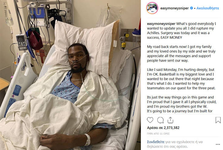 Ο Κέβιν Ντουράντ έκανε αγώνα δρόμου για να προλάβει τον πέμπτο αγώνα των τελικών του NBA με αντίπαλο τους Ράπτορς στο Τορόντο, όμως το γεγονός ότι πίεσε τον εαυτό του να παίξει του στοίχισε πολύ ακριβά. Αγωνιζόμενος εμφανώς ανέτοιμος, μετά από έναν μήνα απουσίας λόγω θλάσης στη γάμπα, αποκόμισε έναν πολύ πιο σοβαρό τραυματισμό που θα τον αφήσει πολύ μεγαλύτερο χρονικό διάστημα εκτός δράσης.
