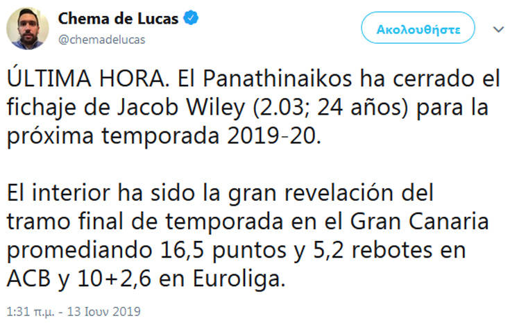 Σύμφωνα με τον Ισπανό δημοσιογράφο, Τσέμα ντε Λούκας, οι «πράσινοι» ήρθαν σε συμφωνία με τον 24χρονο φόργουορντ για την αγωνιστική περίοδο 2019-20. Ο ύψους 2,03 μέτρα Αμερικανός πήγε στα μέσα της περιόδου στην Γκραν Κανάρια, μετρώντας 10 πόντους, 2,6 ριμπάουντ, 1 κόψιμο, 0,9 κλεψίματα κατά μέσο όρο σε 7 συμμετοχές στη EuroLeague και 16,5 πόντους και 5.2 ριμπάουντ στο ισπανικό πρωτάθλημα.