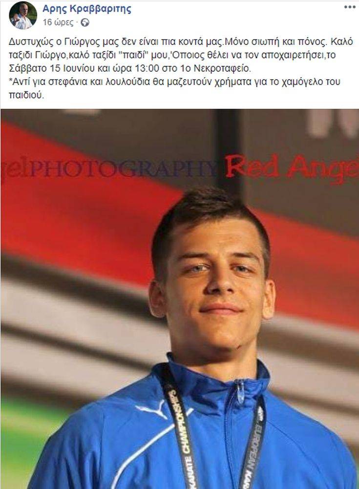 «Δυστυχώς ο Γιώργος μας δεν είναι πια κοντά μας. Μόνο σιωπή και πόνος. Καλό ταξίδι Γιώργο, καλό ταξίδι ”παιδί” μου,’Όποιος θέλει να τον αποχαιρετήσει,το Σάββατο 15 Ιουνίου και ώρα 13:00 στο 1ο Νεκροταφείο. Αντί για στεφάνια και λουλούδια θα μαζευτούν χρήματα για το χαμόγελο του παιδιού», έγραψε στo Facebook o ομοσπονδιακός προπονητής, Άρης Κραββαρίτης.