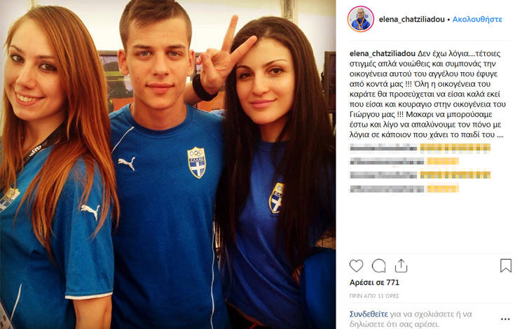«Δεν έχω λόγια….τέτοιες στιγμές απλά νοιώθεις και συμπονάς την οικογένεια αυτού του αγγέλου που έφυγε από κοντά μας !!! Όλη η οικογένεια του καράτε θα προσεύχεται να είσαι καλά εκεί που είσαι και κουράγιο στην οικογένεια του Γιώργου μας !!! Μακάρι να μπορούσαμε έστω και λίγο να απαλύνουμε τον πόνο με λόγια σε κάποιον που χάνει το παιδί του», έγραψε στον προσωπικό της λογαριασμό στο Instagram, η δις παγκόσμια πρωταθλήτρια Ελένη Χατζηλιάδου.