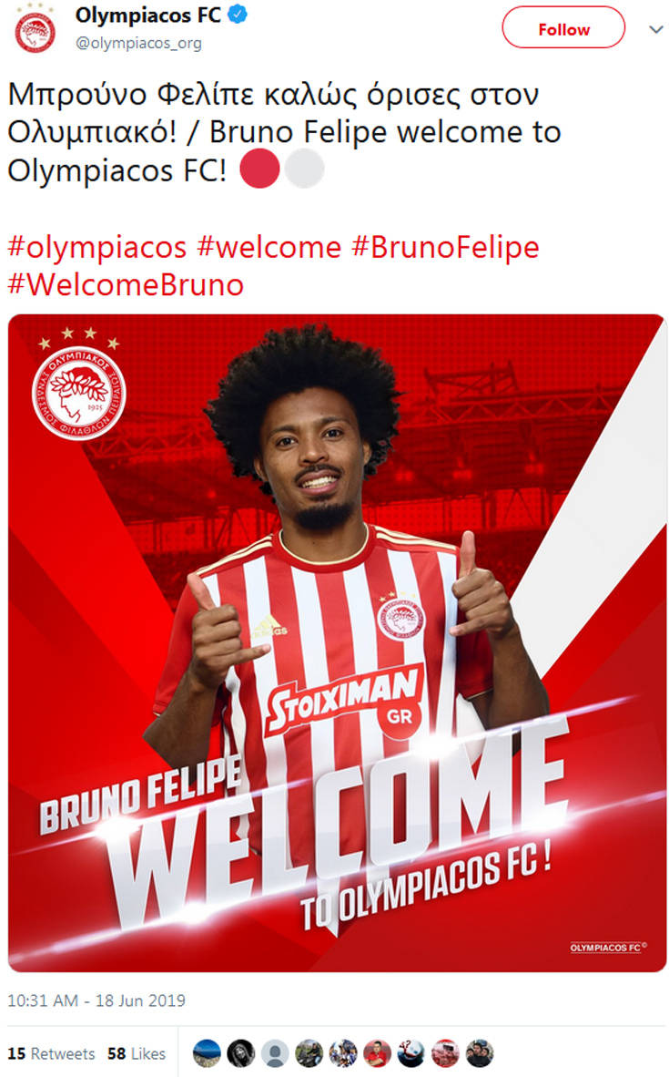 Ο Ολυμπιακός μετά τον Χιλάλ Σουντανί προχώρησε και στην ανακοίνωση της απόκτησης του Βραζιλιάνου Μπρούνο, που έκλεισε με συμβόλαιο διάρκειας τριών ετών.