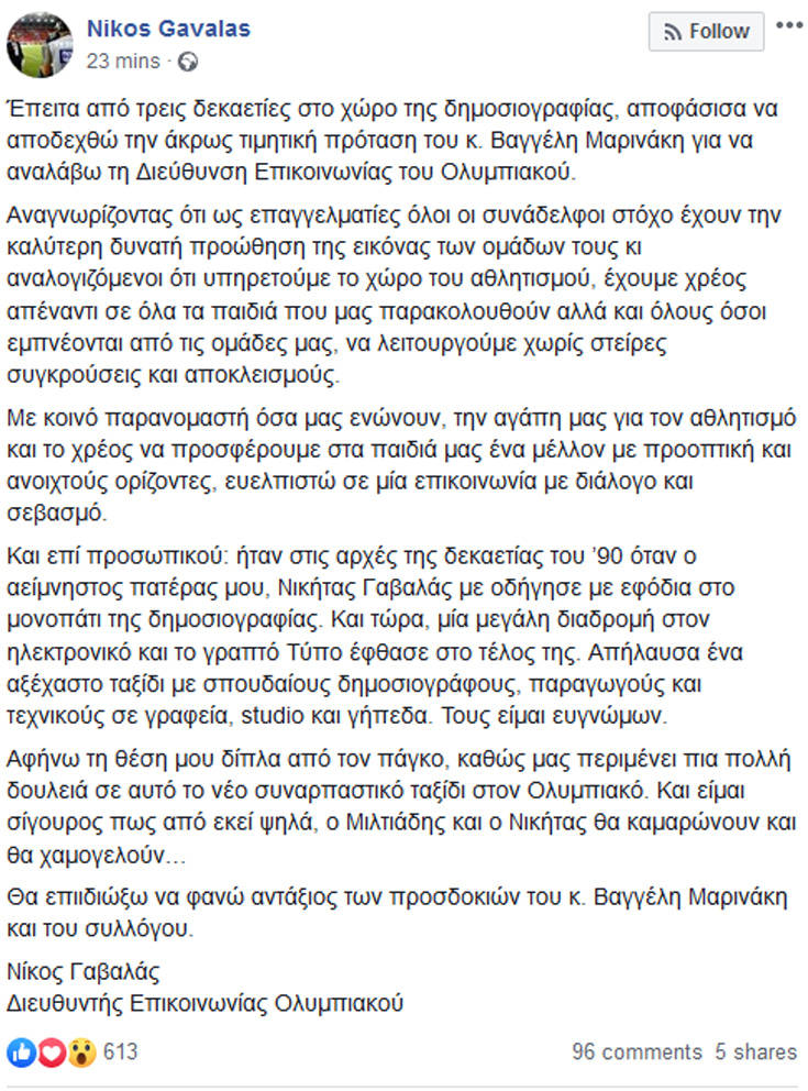 Η ανακοίνωση για τον Νίκο Γαβαλά αναφέρει: «H ΠΑΕ ΟΛΥΜΠΙΑΚΟΣ ανακοινώνει ότι ο δημοσιογράφος κ. Νίκος Γαβαλάς αναλαμβάνει καθήκοντα Διευθυντή Επικοινωνίας (Director of Communication)».
