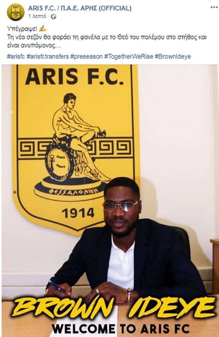 Ο Άρης ολοκλήρωσε την μεγάλη μεταγραφή του Μπράουν Ιντέγε ο οποίος υπέγραψε το μονοετές συμβόλαιο συνεργασίας του με τον Άρη και ανακοινώθηκε επίσημα.