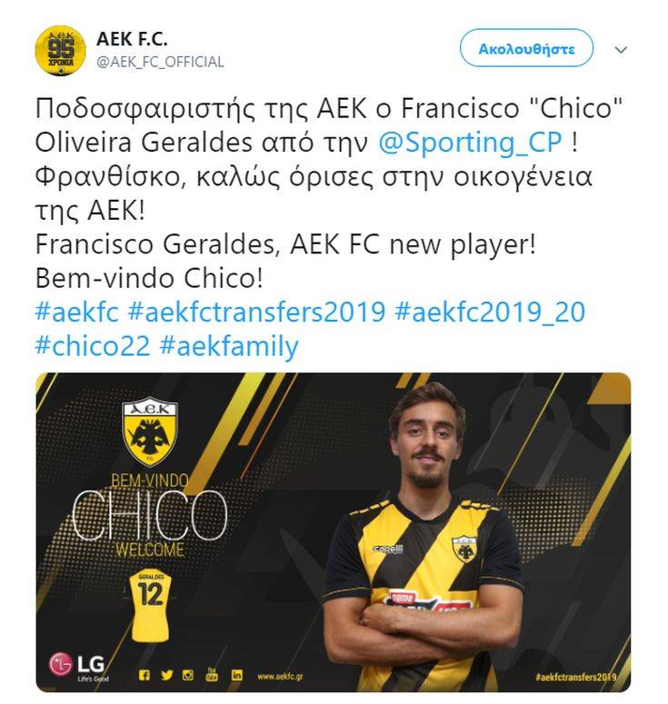 «Η ΠΑΕ ΑΕΚ ανακοινώνει την απόκτηση του ποδοσφαιριστή Φρανθίσκο Ζεράλδες με τη μορφή δανεισμού από την Sporting CP. Ο 24ετών μεσοεπιθετικός θα αγωνίζεται στην ομάδα μας με τον αριθμό 12.