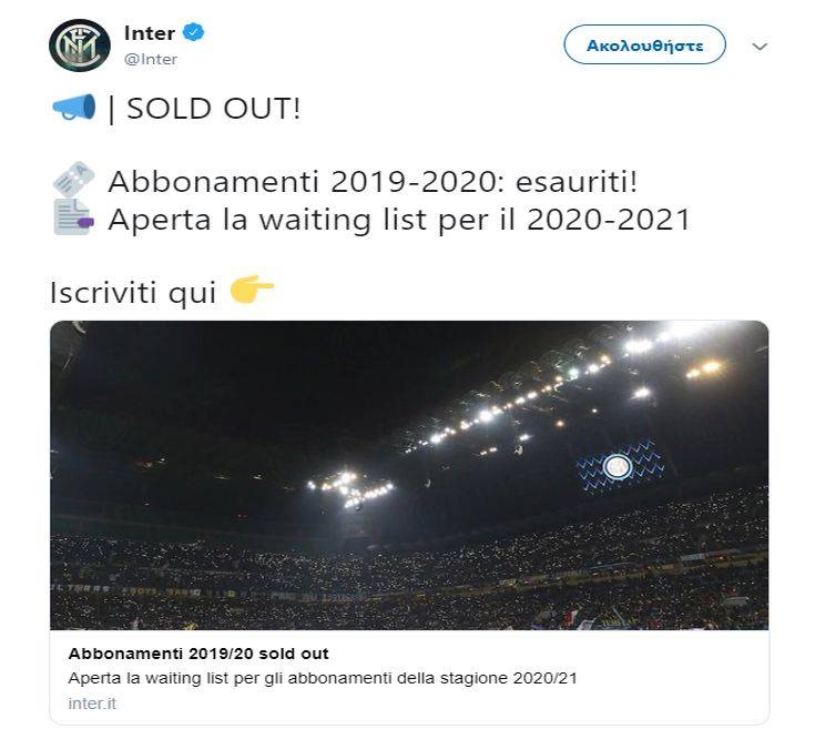 Με τον Αντόνιο Κόντε πλέον στον πάγκο του, ο σύλλογος του Μιλάνου θέλει να μπει δυναμικά στη νέα αγωνιστική περίοδο και σε αυτό θα συμβάλουν και οι τιφόζι, οι οποίοι φρόντισαν να εξαντλήσουν όλα τα εισιτήρια διαρκείας για τη σεζόν 2019-20, που αντιστοιχούν σε 40.000. Μάλιστα, για πρώτη φορά δημιουργήθηκε και λίστα προτεραιότητας για τις κάρτες της αγωνιστικής περιόδου 2020-21.