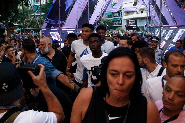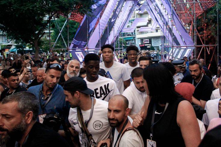 Το γήπεδο του Τρίτωνα σηκώθηκε στο πόδι όταν ο MVP του ΝΒΑ πάτησε ξανά το παρκέ όπου έκανε τα πρώτα μπασκετικά του βήματα, έχοντας στο πλευρό του τα αδέλφια του.