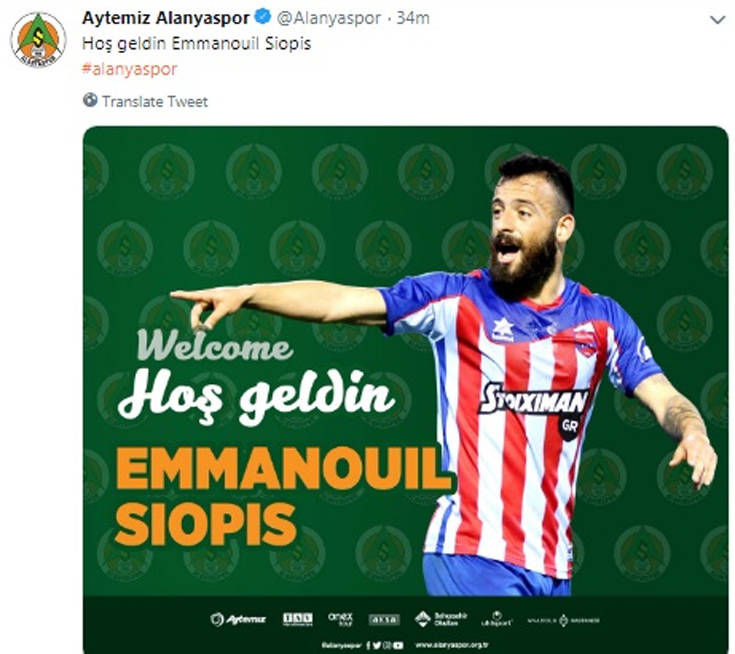 Με ανάρτησή της στους λογαριασμούς της στα social media, η Αλάνιασπορ ανακοίνωσε την απόκτηση του Μανώλη Σιώπη από τον Άρη.