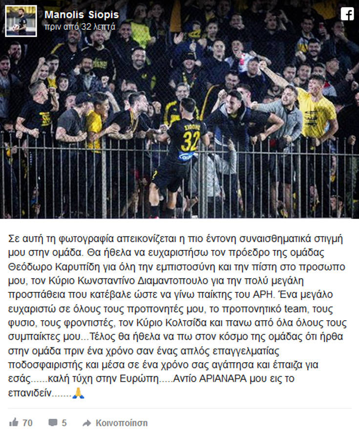 Ο ίδιος αποχαιρέτησε τον Άρη ευχαριστώντας τους διοικούντες, προσθέτοντας πως αγάπησε κι έπαιζε για τον κόσμο των κιτρίνων.