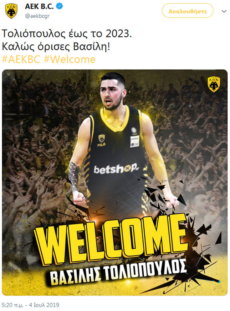 «Η ΑΕΚ ΒC ανακοινώνει, ότι συνήψε σήμερα (04/07) συμφωνία με τον αθλητή Βασίλη Τολιόπουλο.